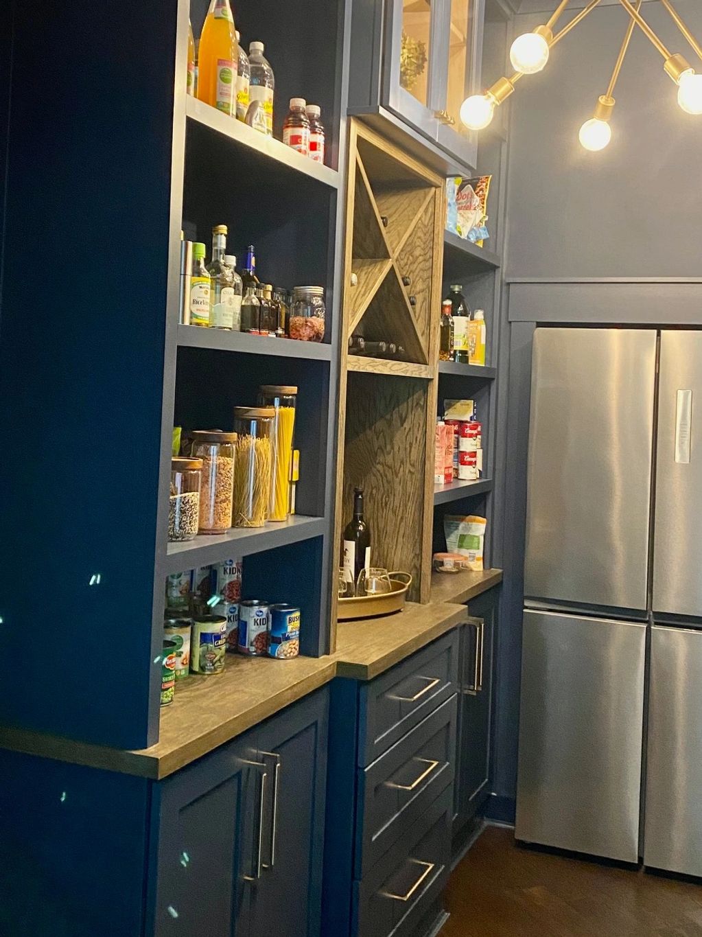 Pantry cabinets & shelves with custom wine rack and glass inlay doors above, featuring a mix of painted and stained oak surfaces